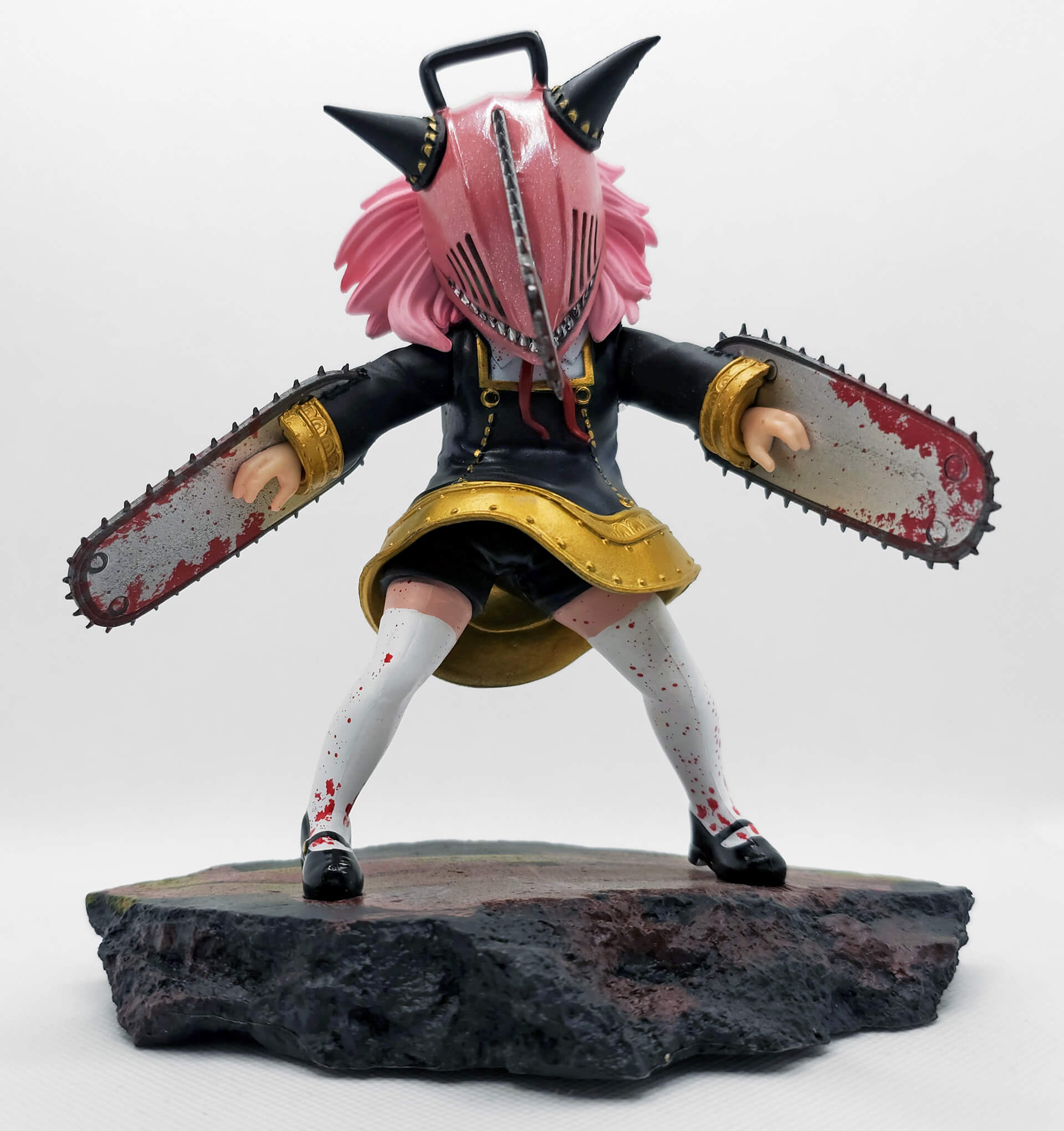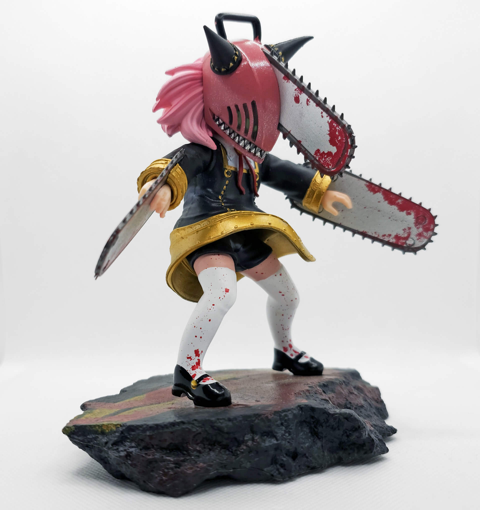 Wie schon bei der Anya-Itachi-Version misst auch diese Figur 18 cm. Beide passen also von der Größe her wunderbar zusammen. Optisch hat man hier meiner Meinung nach sogar noch einen draufgesetzt. Denjis Kettensägenhelm und die beiden teuflisch geformten Hörnchen, zusammen mit den rosa Haaren, sehen einfach extrem cool aus. Die blutbesudelte Kleidung und die beiden Kettensägen an ihren Händen machen den Look perfekt. Mir gefällt auch die Basis ausgesprochen gut. Insgesamt hat man sich an allen Ecken und Enden Mühe gegeben, möglichst viele Details unterzubringen – und das ist hervorragend gelungen. Von den wehenden Klamotten über die toll umgesetzten Stofffalten bis hin zu den metallisch aussehenden Zähnen ist die Figur für diesen Preis ein echtes Prachtstück.
