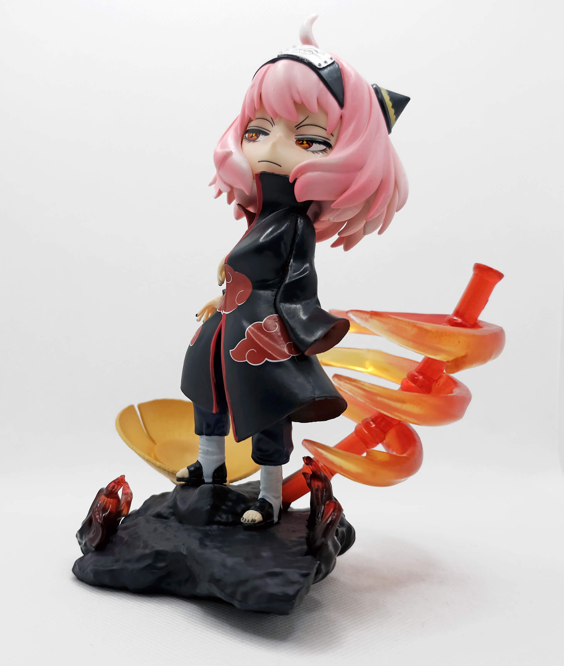 Die Bemalung der Figur ist für den günstigen Preis sehr gut gelungen. Besonders die Augen sehen super aus, und selbst kleine Details wie die bunten Fuß- und Fingernägel wurden schön umgesetzt. Die Itachi-Uchiha-Klamotten stehen Anya ausgezeichnet und die Kombi aus Schwarz mit den roten Akzenten ist klasse. Auch die Basis ist mit viel Liebe zum Detail gestaltet: Von den kleinen Flammen bis hin zum Hut wirkt alles stimmig und passt farblich prima zur Figur. Alles in allem ein echter Blickfang, bei dem es jede Menge zu entdecken gibt.