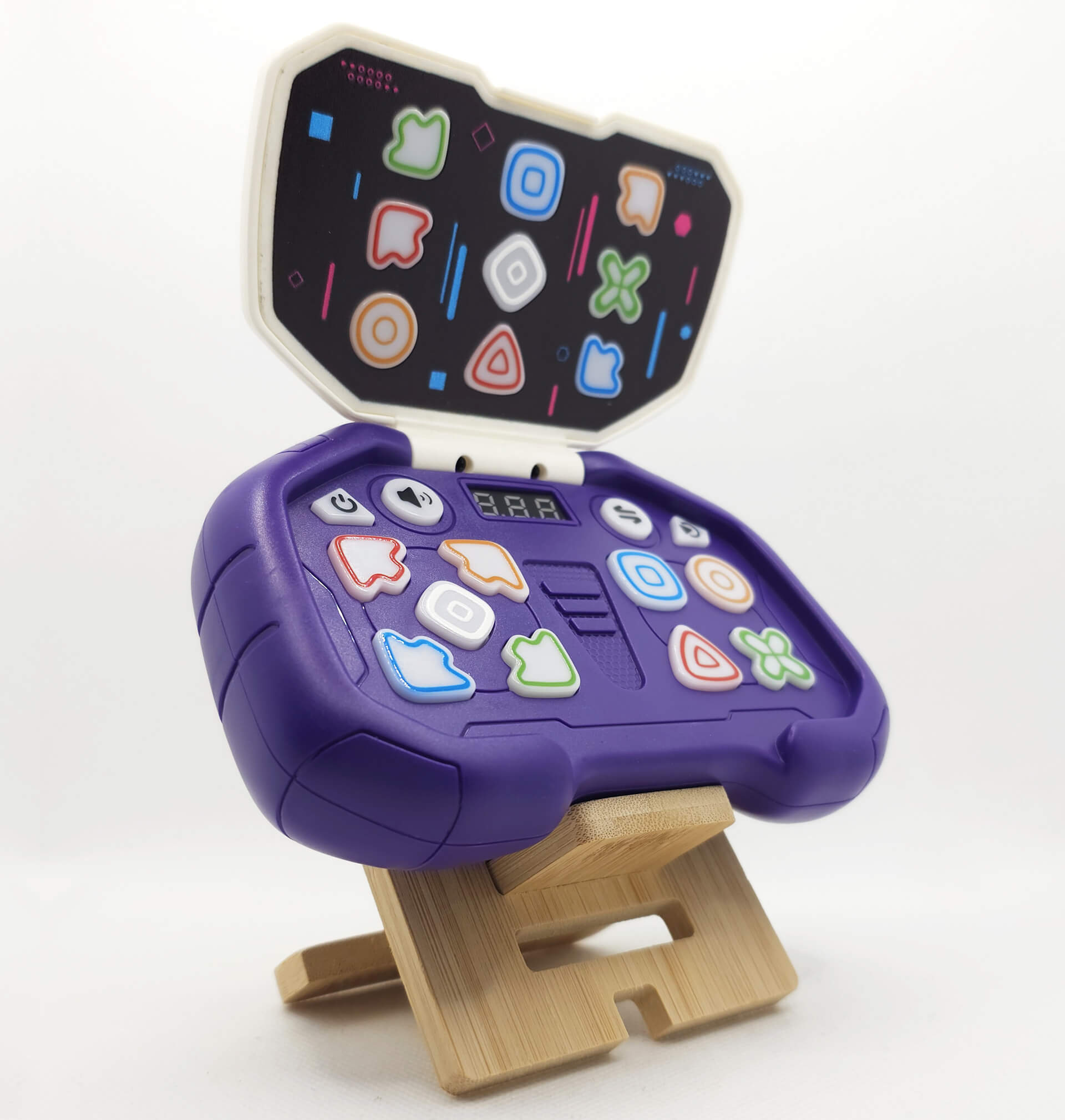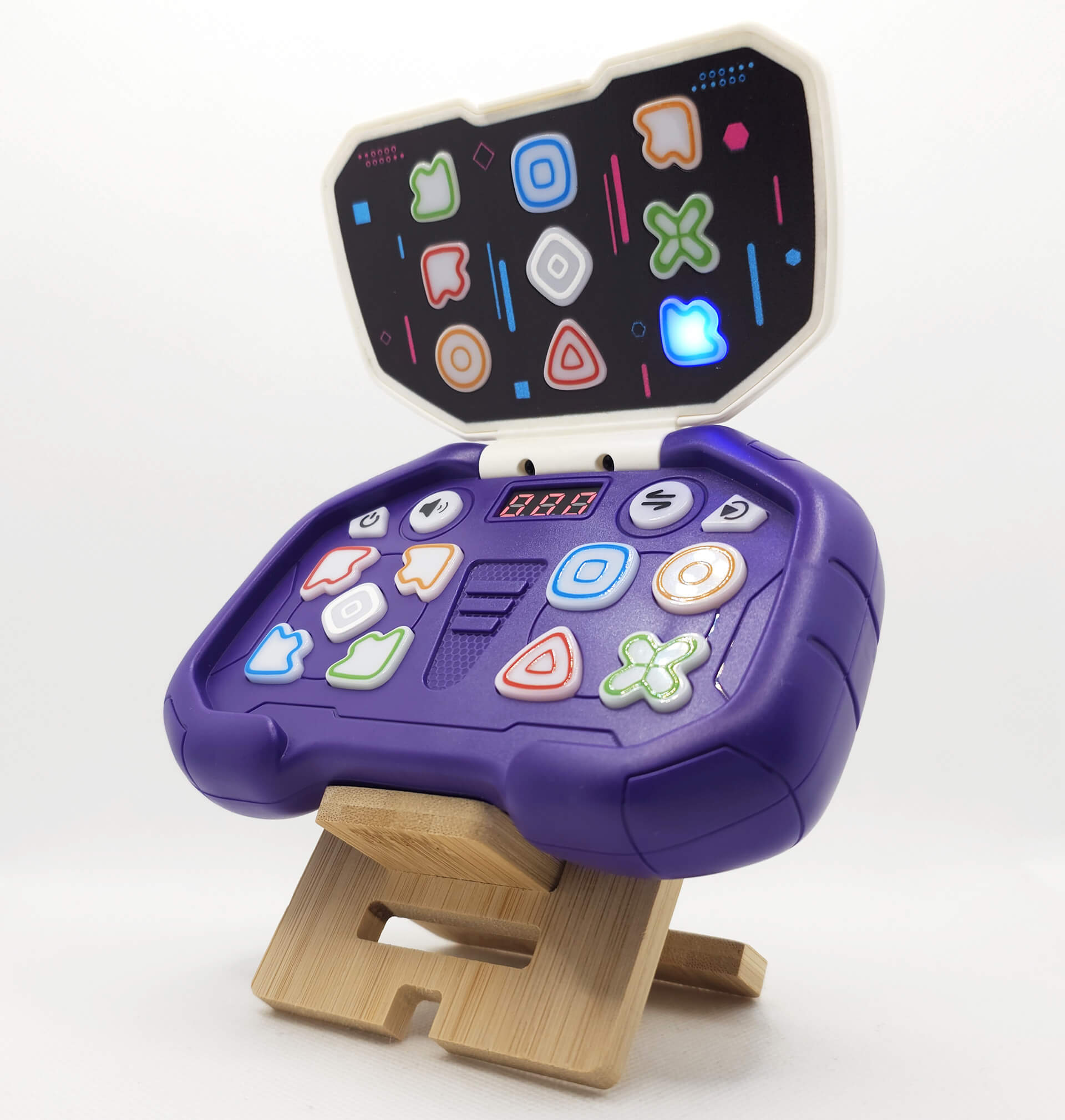 Schaltet man die Konsole ein, wird man mit einem freundlichen „Welcome to the Handheld Dance Machine“ begrüßt. Neben der Powertaste gibt es noch Buttons für die Lautstärke, die Modiauswahl sowie eine Starttaste. Das Spielfeld selbst besteht aus neun unterschiedlich beleuchteten Symboltasten. Diese gibt es auch auf der Oberseite, dort jedoch anders angeordnet – was es beim Spielen kniffelig macht, den korrekten Button zu drücken. Das ist natürlich absichtlich gewollt, damit es nicht zu einfach ist.