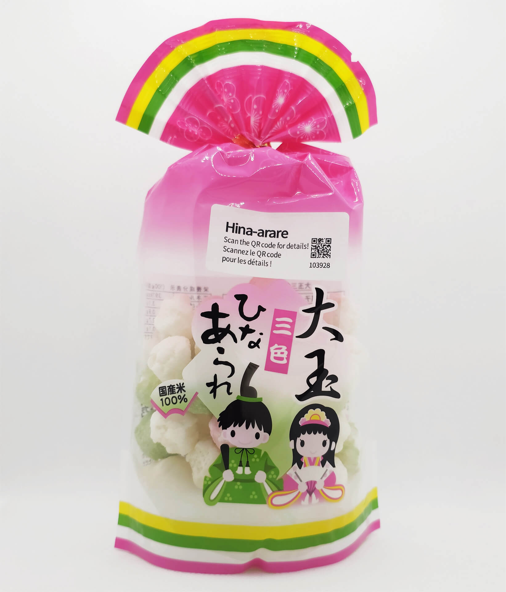 Weiter geht’s mit dem Snack. Auf den freue ich mich schon die ganze Zeit, denn die Hina-arare klingen wirklich verlockend: kleine, farbenfrohe Reiscracker, die Gesundheit und Glück symbolisieren. Diese Edition wird aus japanischem Uruchi-Reis hergestellt – einem nicht klebrigen Kurzreis, der häufig in der Alltagsküche verwendet wird. Traditionell werden sie am 3. März zum Mädchentag gegessen. Ich mampfe sie aber jetzt am 1. April (kein Scherz) für euch. Tüte auf und … yummy! Süß, knackig, genial!