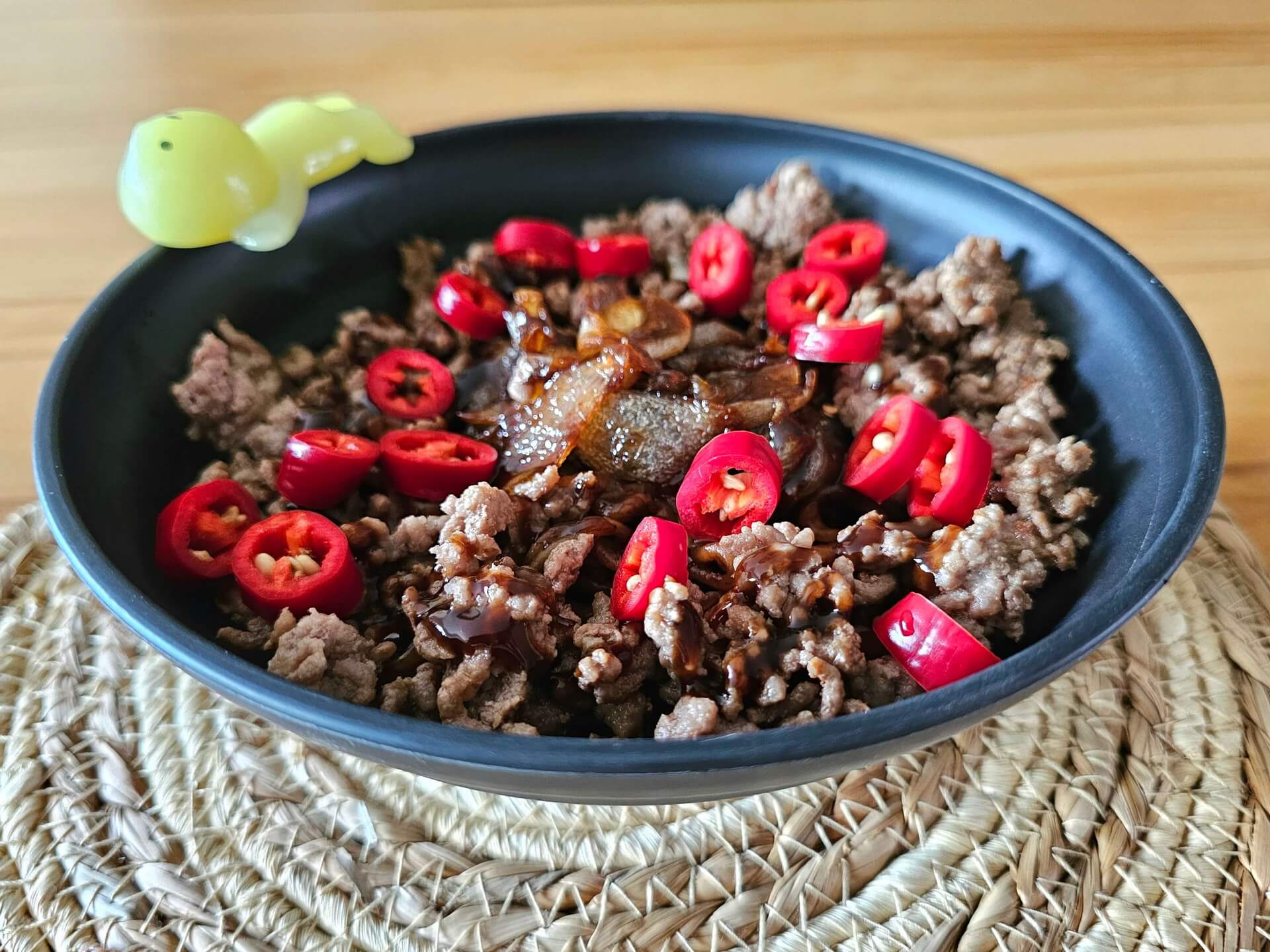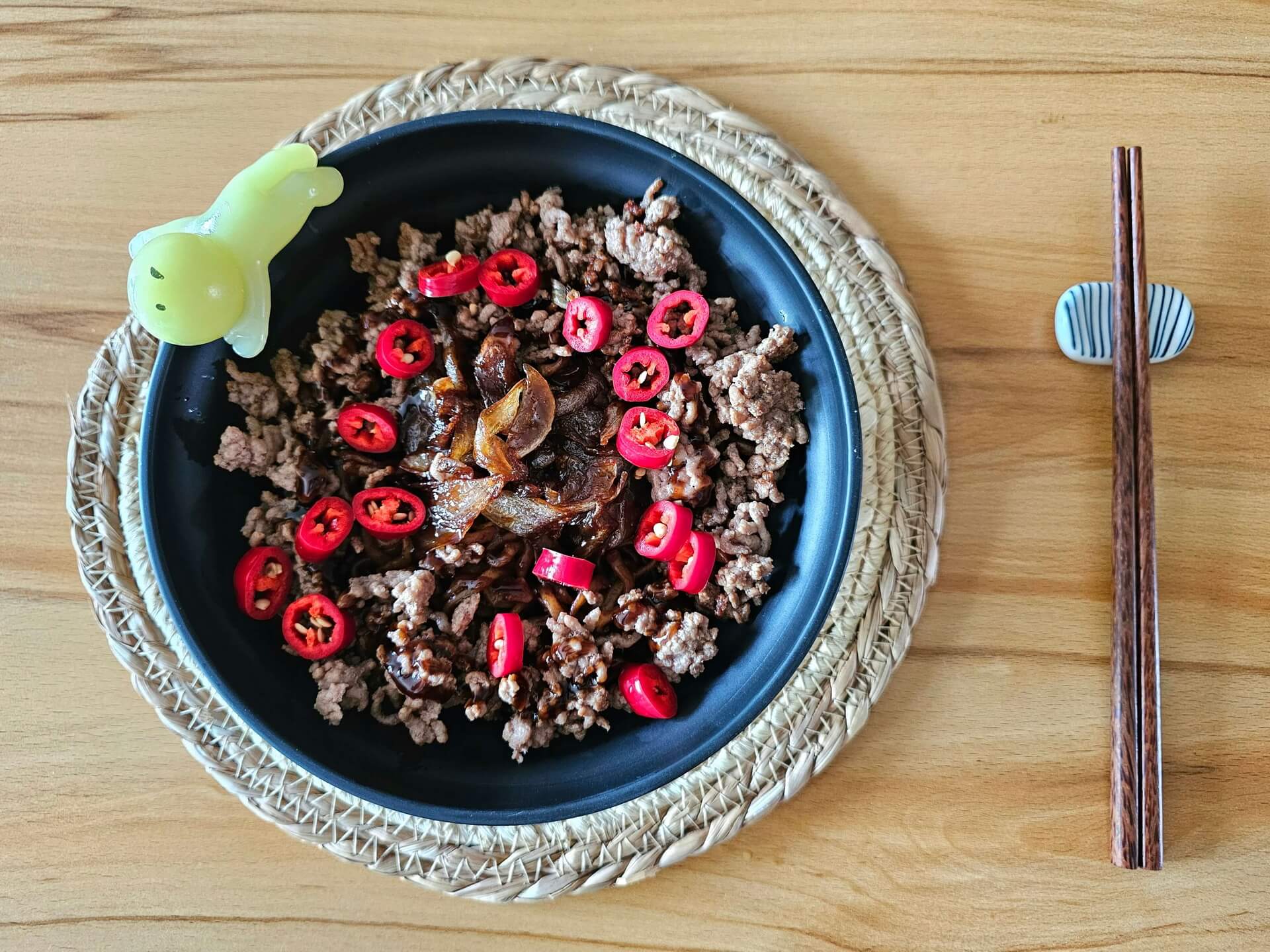 Heute musste ich einiges auffahren, um die Nudeln ein wenig spannender zu bekommen. Und ich darf sagen, es ist mir gut gelungen. 😁 So war es dann tatsächlich noch richtig lecker. Ich habe Zwiebeln karamellisiert – die Süße passt hervorragend zu dem Gericht. Wegen der bisher 0,0 vorhandenen Spicyness sehr kräftig gewürztes, gebratenes Hack dazu. Dann noch eine Runde Hoisin-Soße und eine Chilischote. Scharf, süß, salzig – so wird da ein Schuh draus.