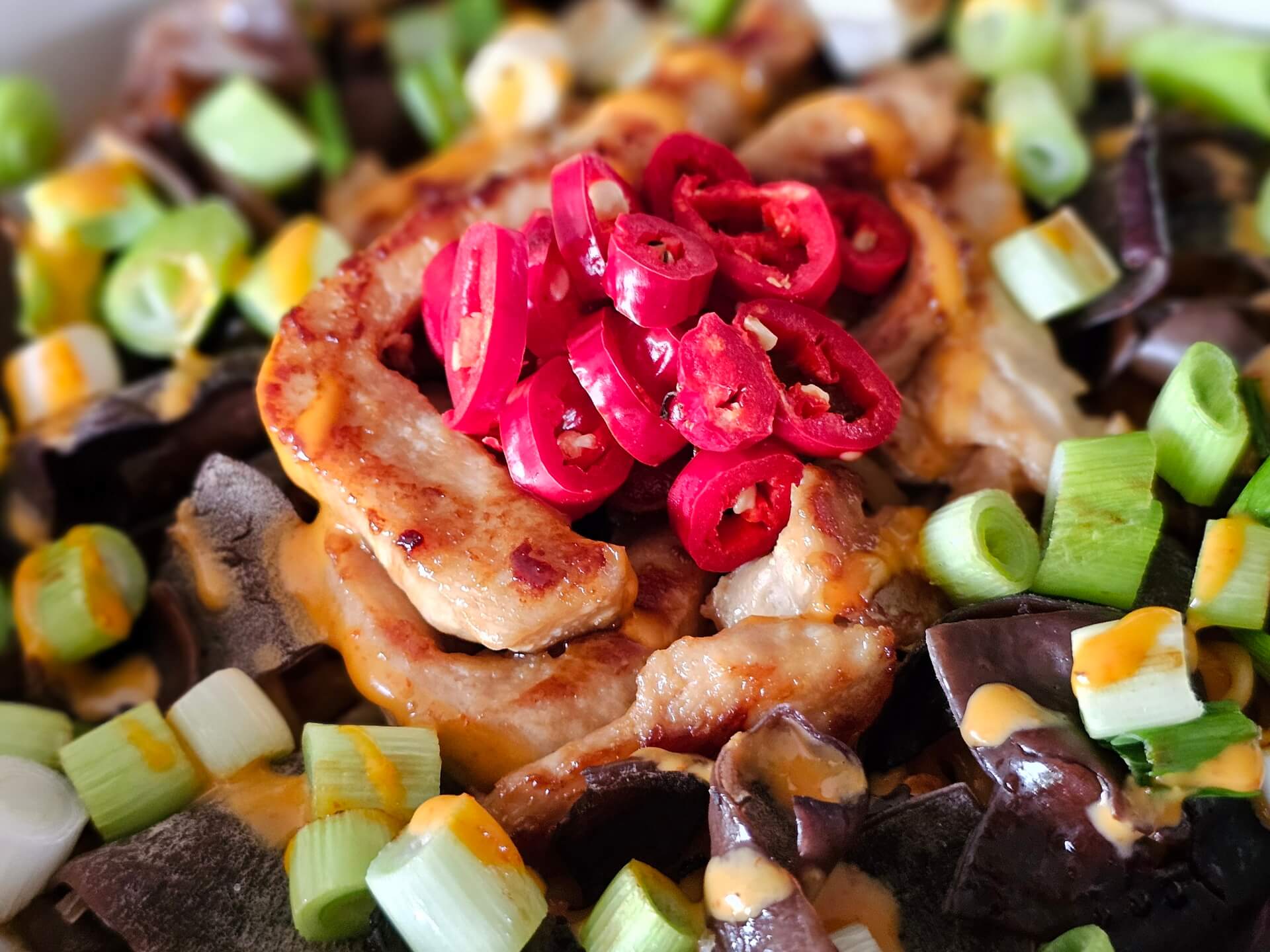 Mu Err-Pilze, Lauchzwiebeln, Chilis, Sriracha-Mayo. Und mariniertes Hähnchengeschnetzeltes. Oh, ich glaube, ich hab da jemanden fragen hören „Hey Emma, warum sieht dein Fleisch denn bloß so toll und appetitlich aus?“. Das kann ich euch gerne sagen: Es wurde mariniert in 3 EL Sojasoße und, Geheimtipp, 1 EL Speisestärke! Das macht es wunderbar mürbe und sorgt für die schöne braune Knusprigkeit. Guten Appetit!