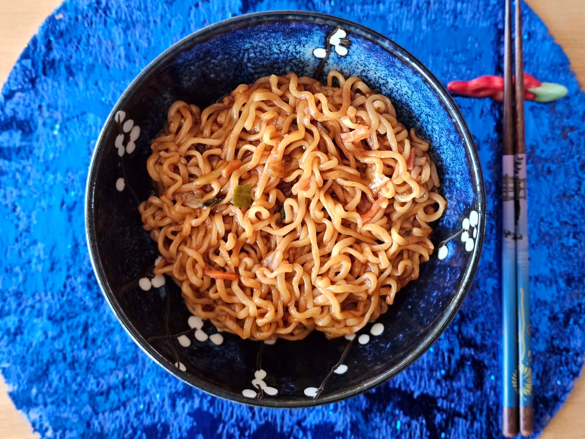 Zwei Dinge fallen auf. Das Erste sind die sehr schön großen Gemüsestücke, das Zweite: Bei der geringen Wassermenge sind die Nudeln kaum mit Flüssigkeit bedeckt und man muss ab und zu umrühren, damit sie gleichmäßig gegart werden. Ich würde einfach mal behaupten, es spricht nichts dagegen, dass man sie mit mehr Wasser kocht und dann am Schluss etwas abgießt, bevor man die Soße dazugibt. Apropos Soße: Die riecht gewohnt nach Buldak, aber mit einem Twist. Da ziehen einem Gerüche in die Nase, die deutlich frischer sind als üblich. Das unverdünnt vom Beutel abgeschleckte Probetröpfchen verheißt durchaus eine ordentliche Schärfe und brennt noch nach, während ich schon die Fotos vom fertigen Gericht mache. Gut so!