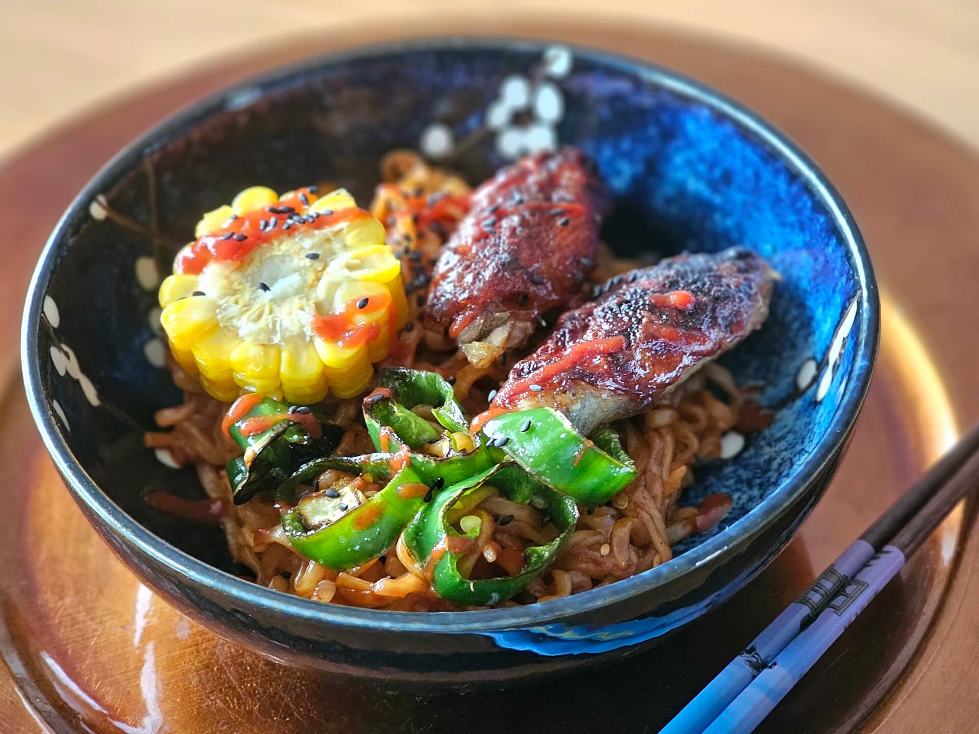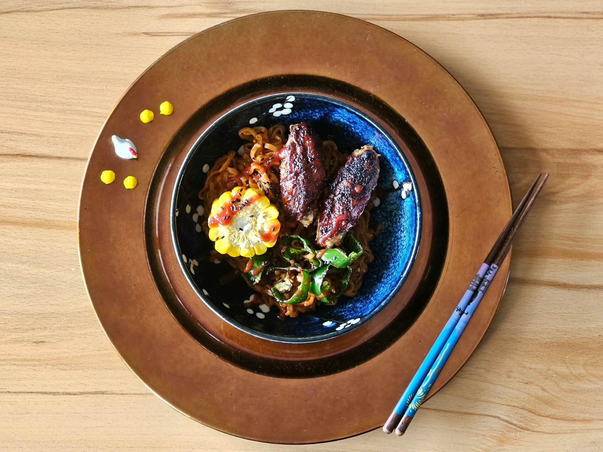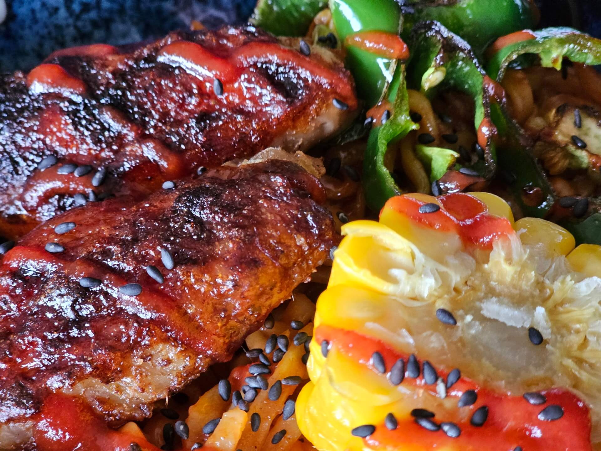 Wenn wir hier schon ein BBQ-Hähnchen-Gericht haben, dann ziehen wir das auch durch: Marinierte Chicken Wings (würzen, 30 Minuten in den Ofen, rausholen, mit einer Mischung aus Barbecuesoße, Ketchup und Honig bestreichen und noch mal 5 Minuten mit Grillfunktion in den Ofen), Zuckermais und ein bisschen leicht bittere Bratpaprika, um der Süße etwas entgegenzusetzen. Sriracha, Sesam, voilà.