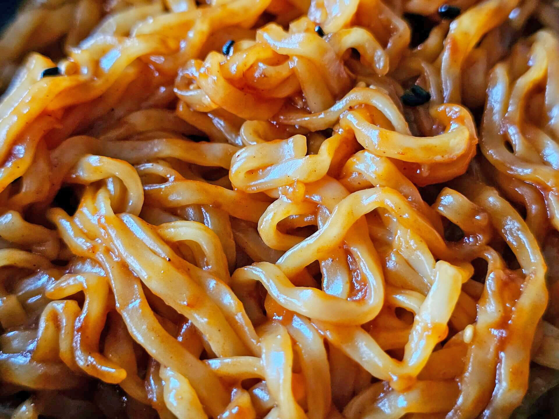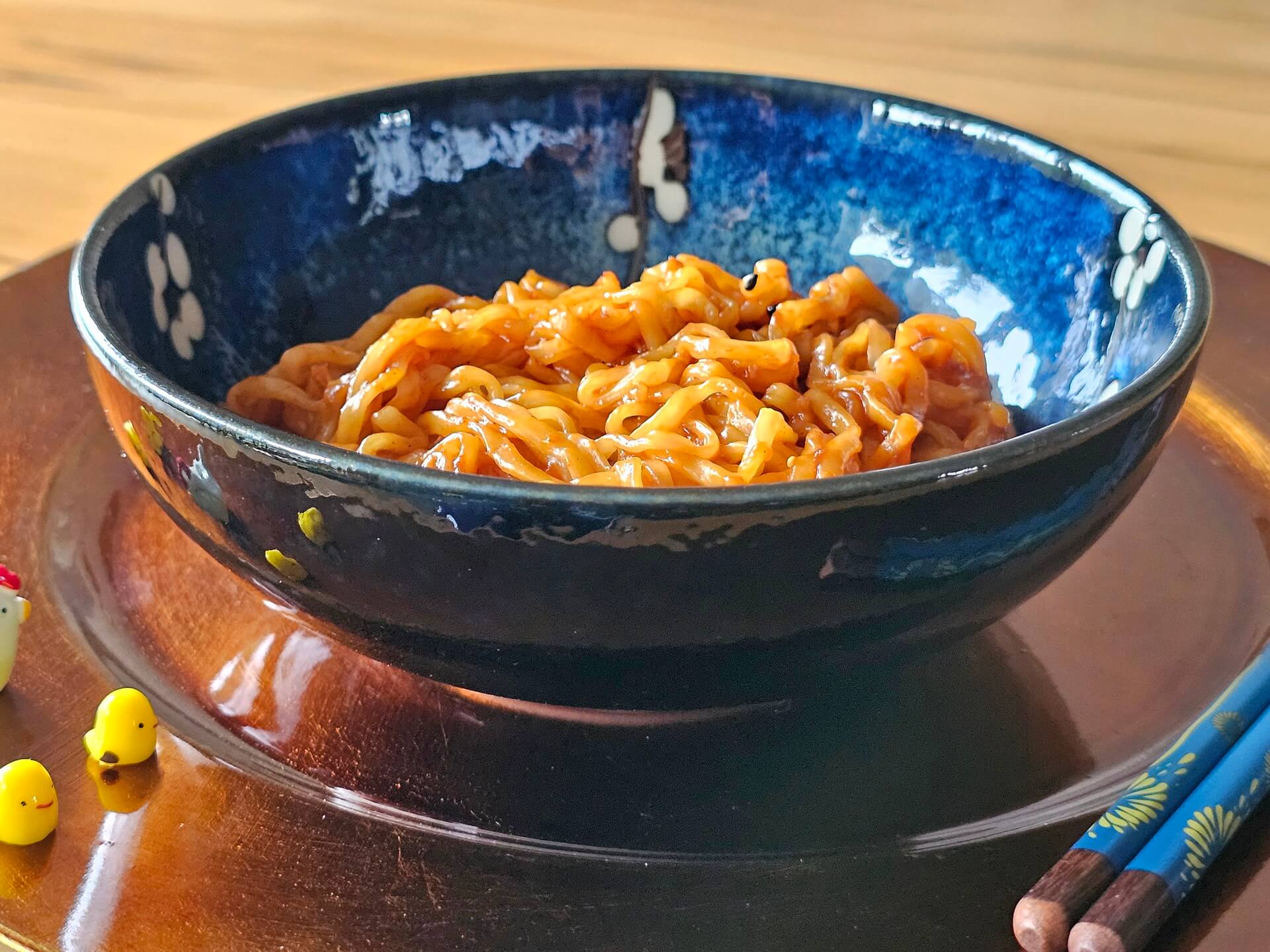 Das von der Packung abgeschleckte obligatorische Probiertröpfchen schmeckt ziemlich ähnlich wie die normale Buldak-Soße, nur ein ordentliches Stück süßer. Erst mal nicht so spektakulär. Aber dann, als die Soße sich im Topf mit den Nudeln vermischt, bricht plötzlich Weihnachtsstimmung aus! Es riecht so dermaßen aromatisch und zimtig-süßlich, als wäre das Christkind höchstpersönlich mit einem großen Gewürzstreuer hier durchmarschiert.