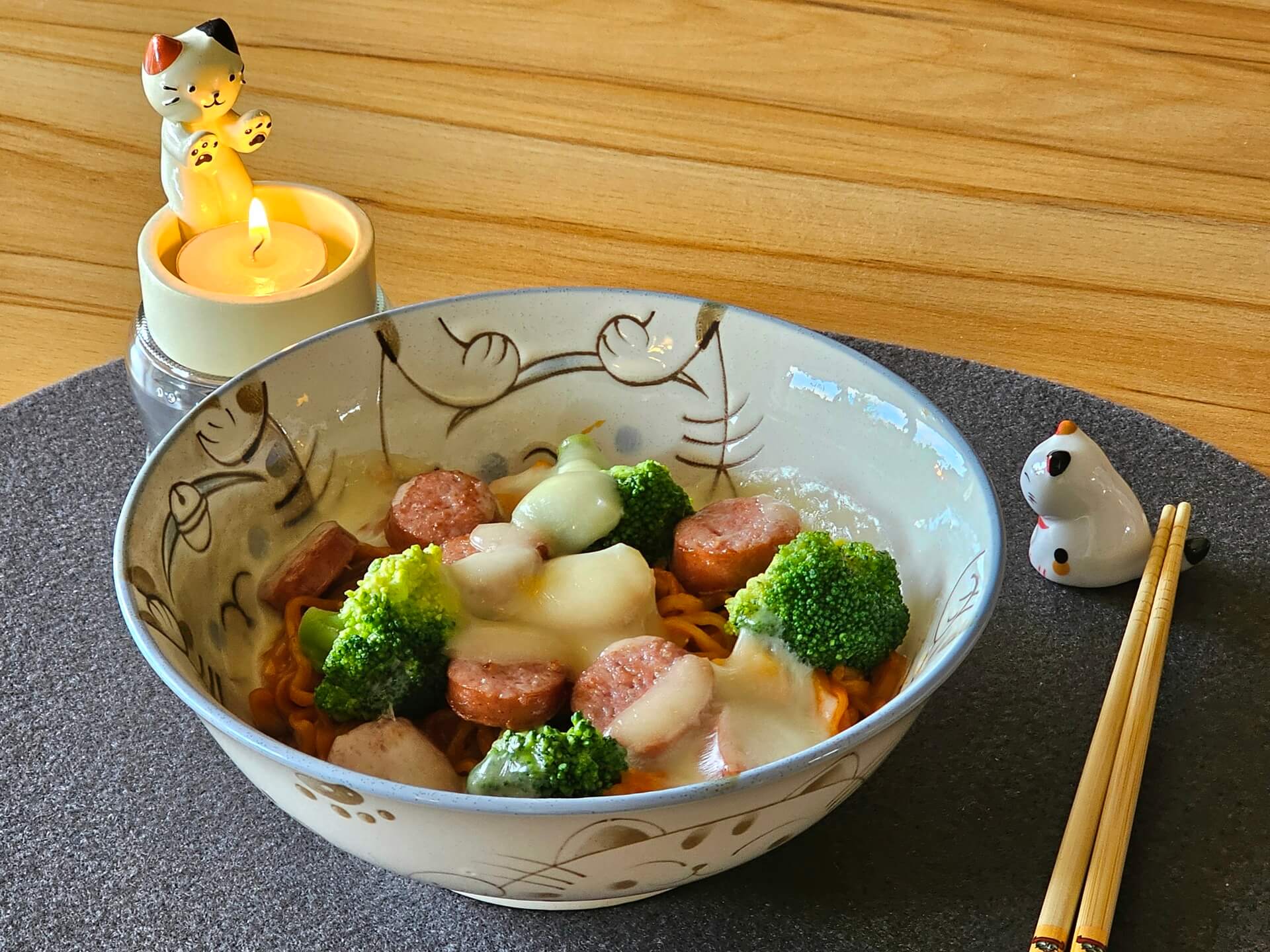 Außer Kalorien sind unter anderem noch folgende Zutaten im Ramenpackerl: Knoblauch, Zucker, künstliches Hähnchenaroma, Chili, Sojasoße, schwarzer und roter Pfeffer, Schmelzkäse, Zwiebeln… Das klingt SO GUT! Und weil man online kaum Hintergrundwissen über diese Käsebombe findet, das wir hier an unsere Lieblingsleser (euch!) weitergeben könnten, kann ich mich ohne Verzögerung auf direktem Wege in die Küche begeben und lege los mit den Vorbereitungen für das große Käsefest.