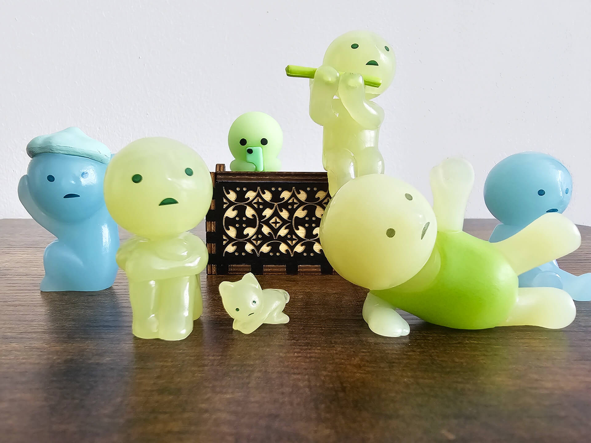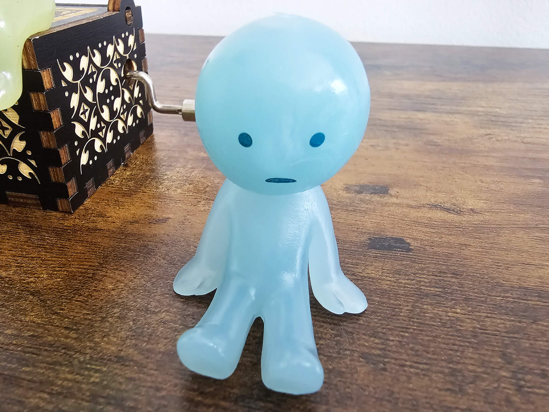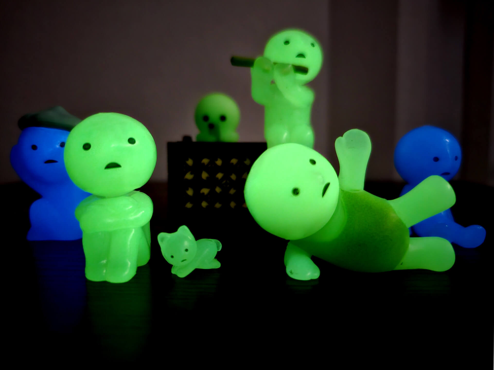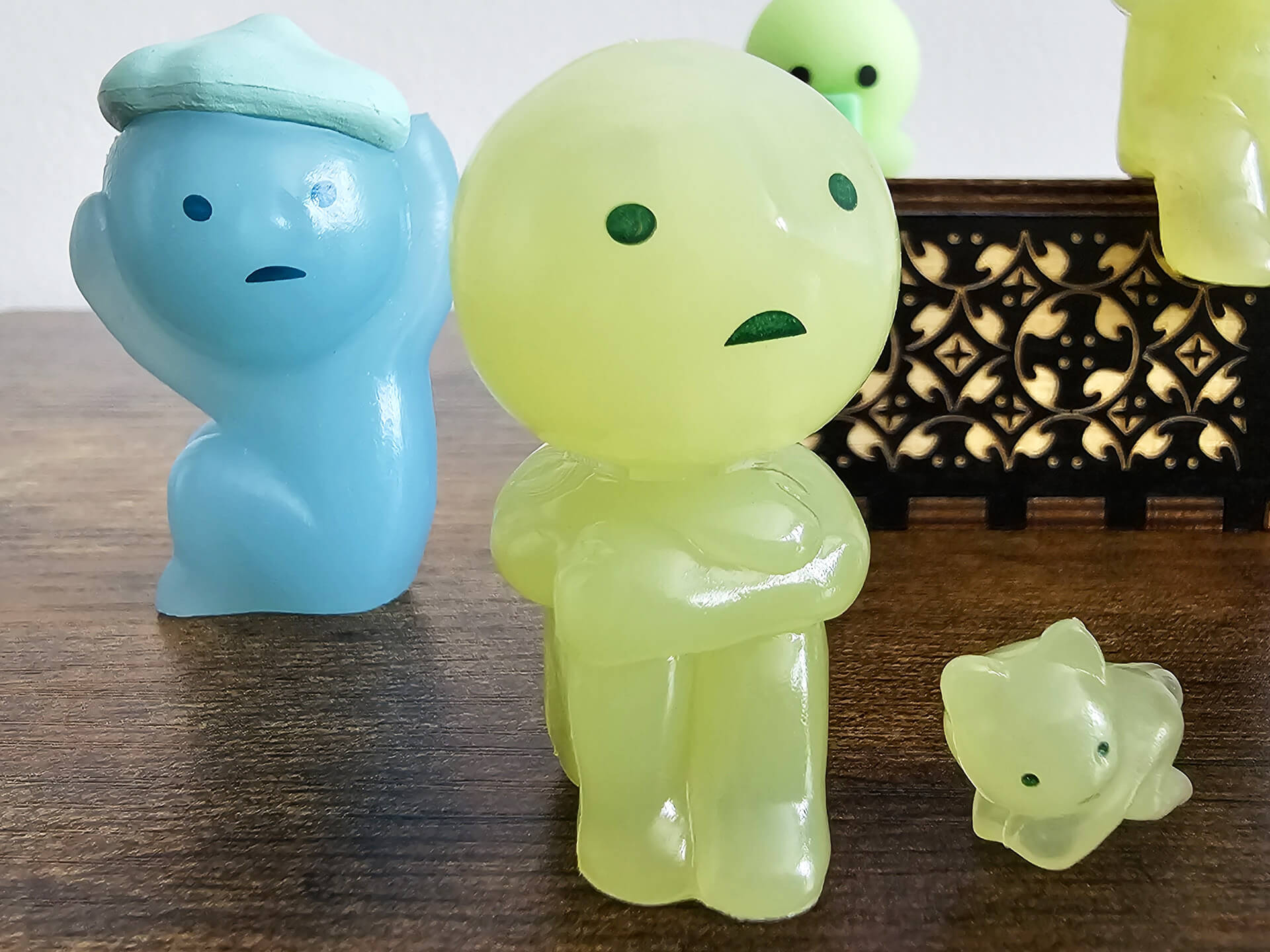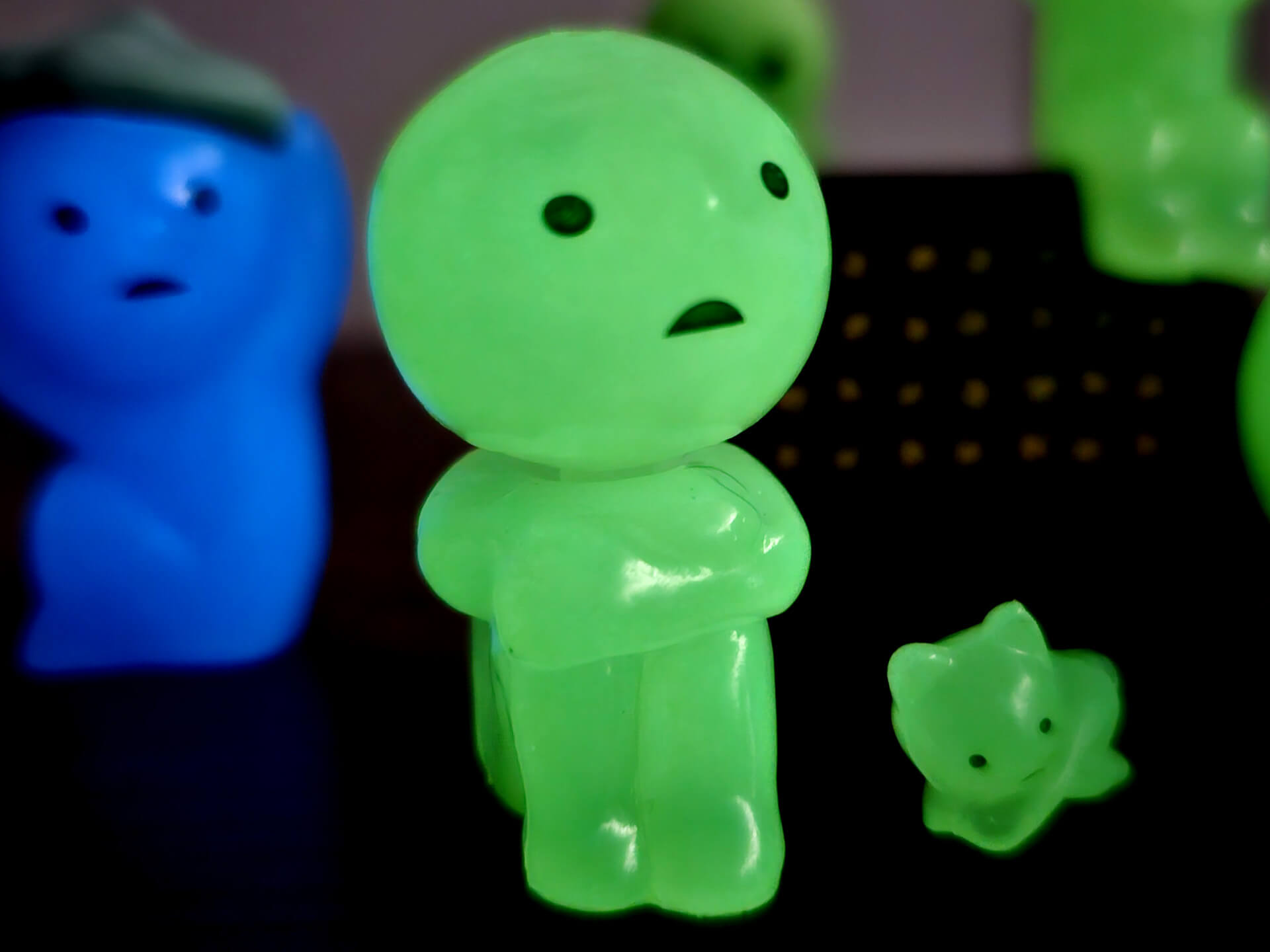 Qualitativ sind die Figuren durchaus okay für den günstigen Preis. Einzige Kritik: Teilweise sind die Augen oder Münder etwas blass aufgemalt. Wer mag, kann mit einem schwarzen Stift leicht nachbessern – ich habe das für die Review-Fotos bewusst nicht gemacht, um nichts zu verfälschen. Tipp: Stifte zur Beschriftung von CDs oder DVDs eignen sich hierfür hervorragend. Sie haben eine feine Spitze, sind präzise und die Farbe hält zuverlässig. Ansonsten gibt es kaum etwas zu bemängeln, bis auf hier und da mal eine leicht sichtbare Kante. Die Leuchtkraft ist dafür wieder sehr gut. Das sieht schon ziemlich knuffig aus, wenn die kleinen Manschgerl in einem dunklen Zimmer vor sich hin strahlen.