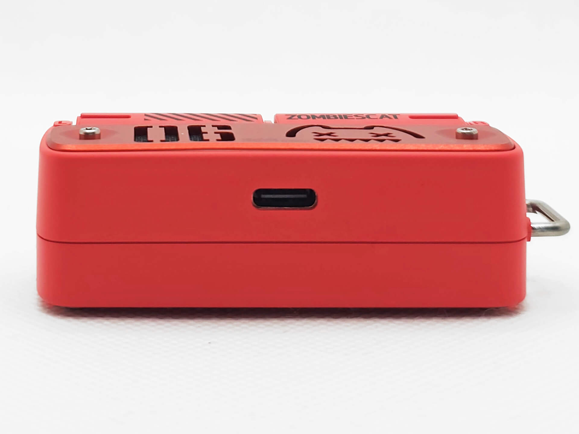 Fangen wir mit dem 6,5 cm x 2,0 cm x 2,5 cm großen Ladecase an. Es besteht aus Kunststoff, hat jedoch vorne und hinten verschraubte Metallplatten mit dem charakteristischen ZOMBIESCAT-Design. Auf der Vorderseite wurden die Katze und die „06“ aus dem Metall herausgeschnitten und mit coolen RGB‑Lichteffekten hinterlegt. Lädt das Case, pulsiert die Beleuchtung in verschiedenen Farben und leuchtet dann konstant blau, sobald der Akku 100 % erreicht hat. Diese lässigen Farbspielereien sind auch für einige Sekunden zu sehen, wenn die Kopfhörer in das Ladecase gesteckt werden.